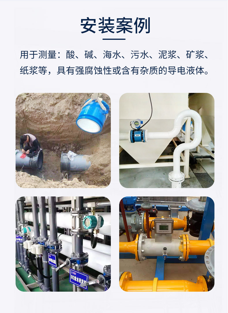 可測介質:水、污水、鹽水、海水、循環水、空調水、消防水、氨水、硫酸、硝酸、鹽酸、醋酸、氫氟酸、堿溶液、果汁、果漿、泥漿、紙漿、煤漿等導電液體,特别适用于有腐蝕性的酸堿液體。